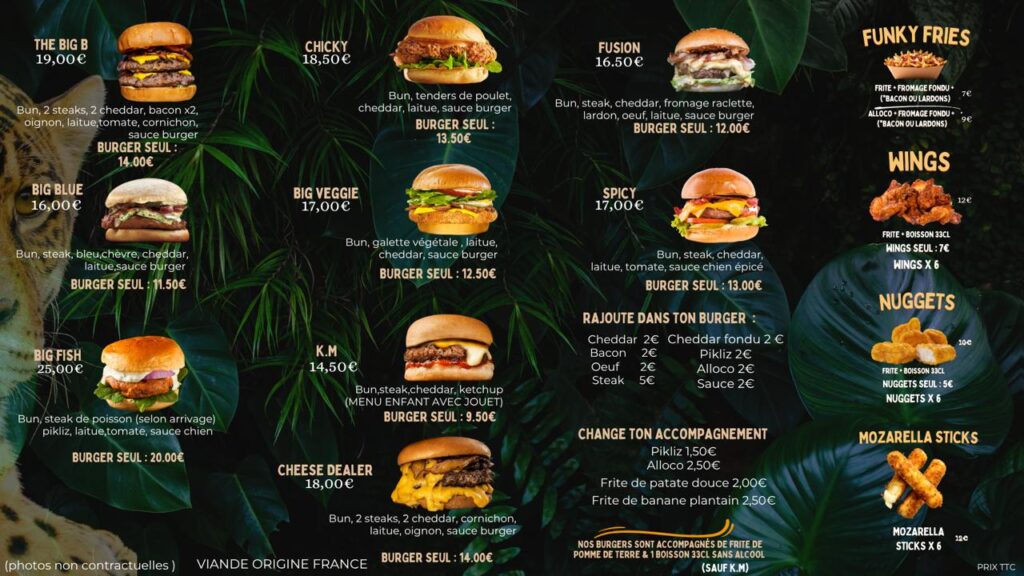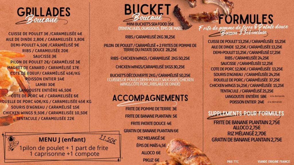MENU PERRIN GRILL BY CB Menu GRILLADES – BUCKET – FORMULES FORMULES LAMBI – BOISSONS – MILKSHAKES – BB ICE – COCKTAILS BURGERS – FUNCKY FRIES – Wings – NUGGETS MENU ENFANT On prend soin de tout le monde ici ! PERRIN GRILL ? On vous livre ! NOUS TROUVER RESTAURANT ABYMES : Rue Adrien Legrand Perrin, Les Abymes. FOOD-TRUCK MORNE À L’EAU : 3 chemin de GENSOLIN morne à l’eau Horaires : Mardi – Samedi 17:30 – 22:30Dimanche & Lundi : Fermé Facebook Instagram Snapchat Tiktok PERRIN GRILL Instagram THE BIG B BURGER 0 590 93 27 78 0 690 71 08 22 © 2025 THE PERRIN GRILL. Tous droits réservés. Site conçu et développé par TDF Consulting.